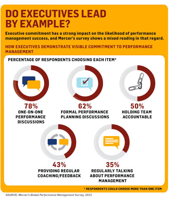 The 2013 Mercer Global Performance Management Survey reported that one in three organizations said the ability of managers and employees to engage in performance conversations is key and has the greatest impact on company performance, and that performance management initiatives could and should be more effective. Only 3% of the 1,050 survey participants from 53 countries say their performance management program provides exceptional value.